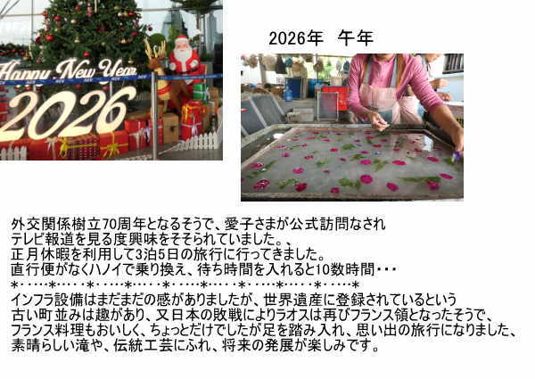 | 25年末~'26年始、ちょっとだけラオス行ってきました。 わずか5日間の短い旅でしたがラオスの自然の魅力をあじわいました 愛子さま公式訪問後ツアー客が多くなったとよろこんでいました。。 |